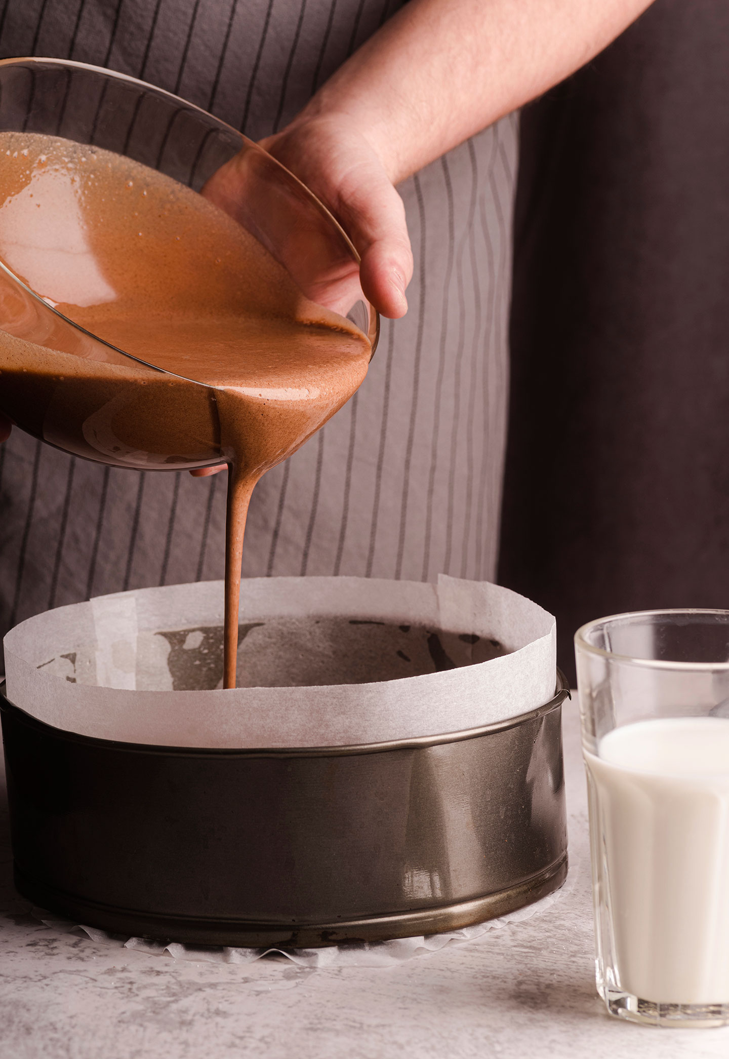 Pour the batter into the greased cake pan and smooth the top with a spatula.